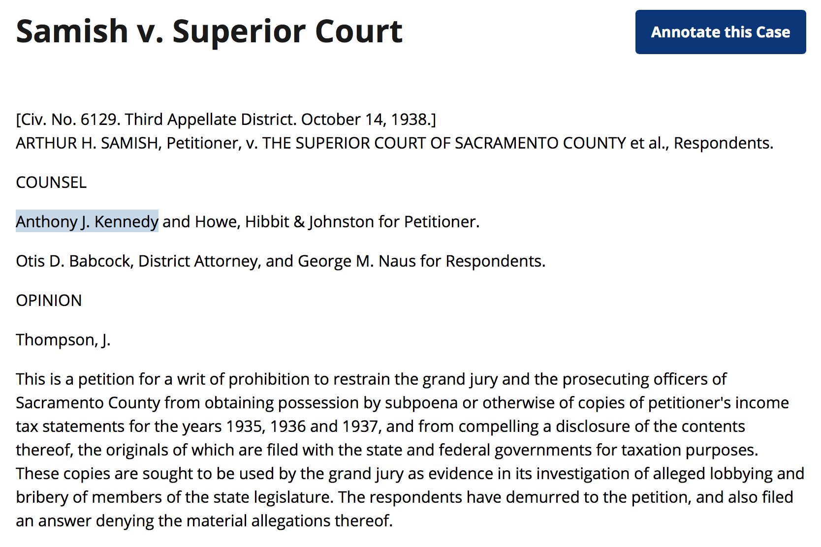 And like all big mob bosses, he had his own attorney. Someone whose solo practice revolved around him. Take a gander. That’s Justice Kennedy’s dad.